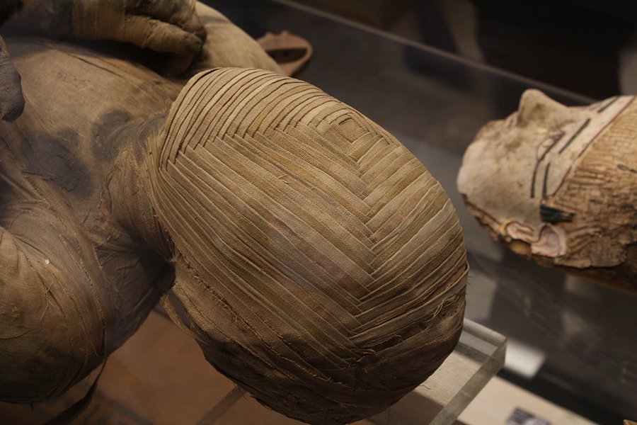 Многослойные льняные полосы, некоторые из которых расположены в характерный узор для сохранения формы лица. На повязках видны темные пятна — следы масел и смол (кедровое масло, ладан, миррха), которыми пропитывались ткани.