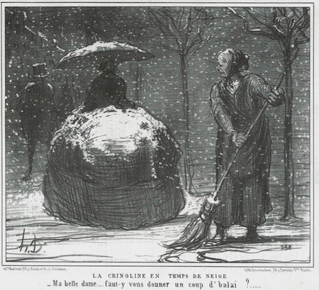 [15] Иллюстрация из немецкого юмористического журнала «Fliegende Blätter», 1857 г. [16] Кринолин зимой. Карикатура Оноре Домье. 1858 год. «Госпожа, если угодно, я с вас смету?»