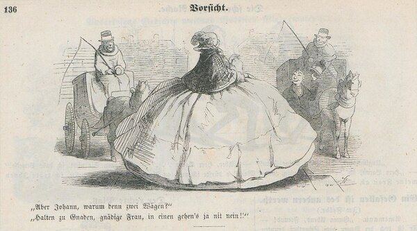 Мужскому полу приходилось теснится в общественных транспортах, дамы занимали практически всё место на тротуарах. Частые риски вокруг передвижения, возможность застревания в дверных проемах или травм стало частью общественного нарратива.