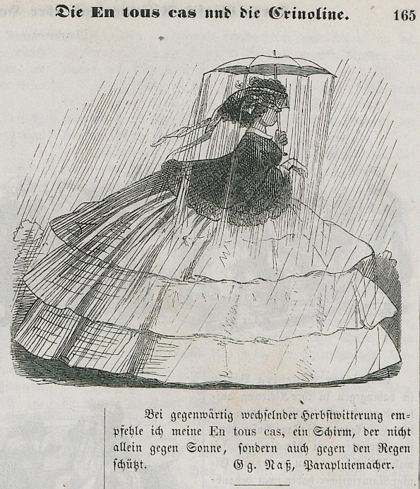 К 1857 году стала появляться различного вида реклама, пропагандирующая комфорт ношения кринолинов и мода пошла в массы.