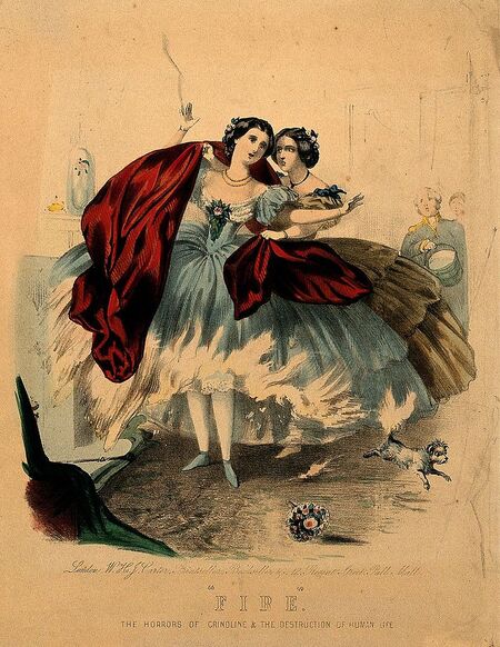 Огромный объем кринолина создавал эффект «дымохода». Когда подол платья загорался, огонь благодаря обилию воздуха быстро распространялся по всей длине юбки вверх, практически мгновенно охватывая все тело женщины. На литографиях изображена балерина Эмма Ливри, платье которой стало объектом пожара и причиной летального исхода девушки в 1863 году. Подобные инциденты стали нередкими новостными журнальными заголовками.