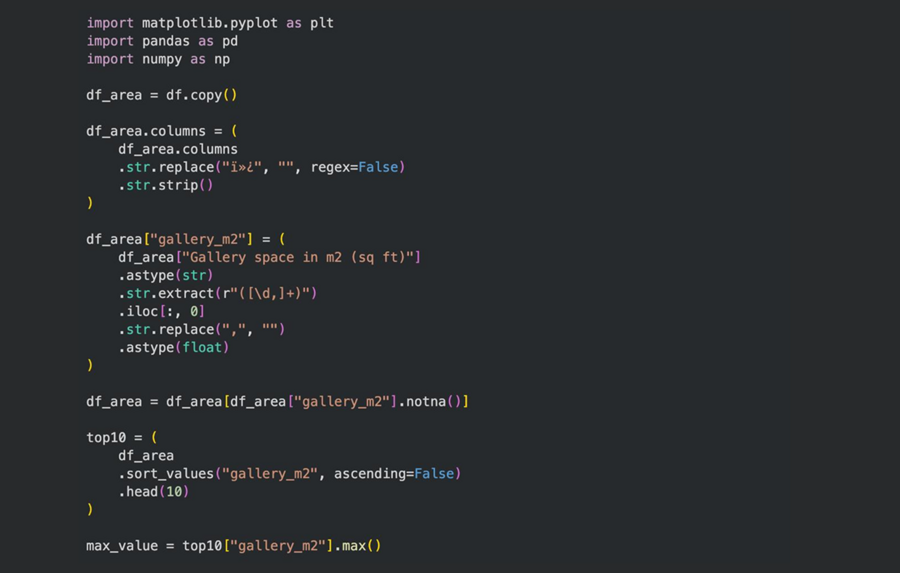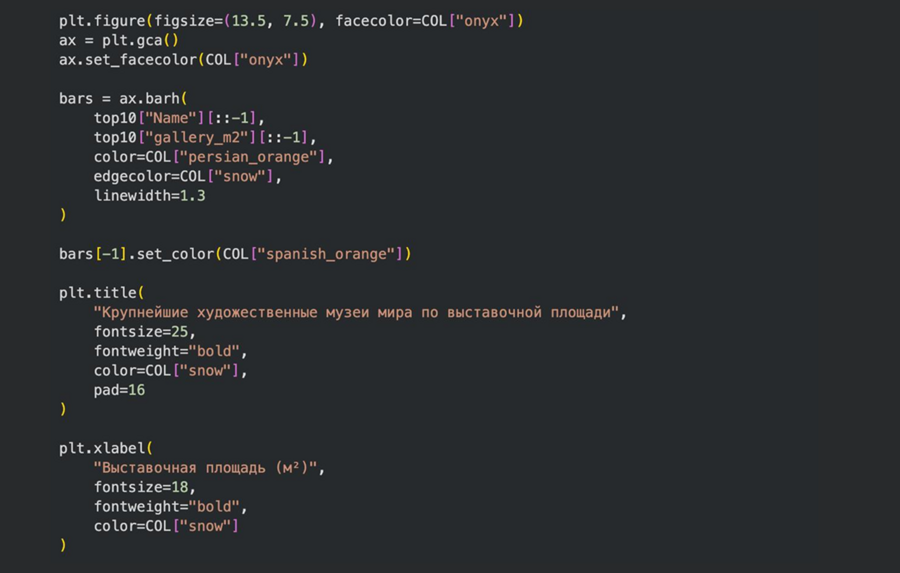 • Ранжирование и анализ экстремальных значений — использовались для выявления крупнейших музеев по выставочной площади. Сортировка и отбор топ-10 позволили сосредоточиться на наиболее значимых объектах и сравнить их относительный масштаб.