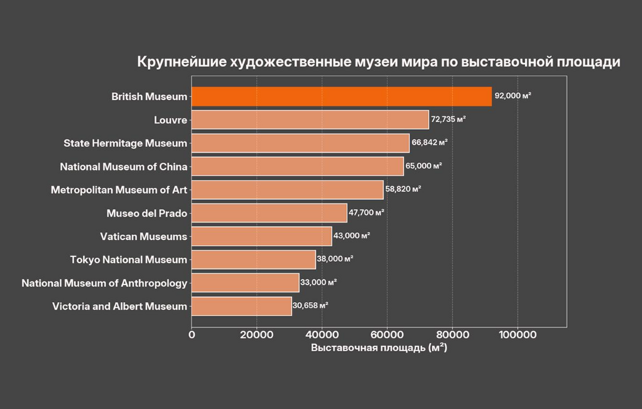 На графике показаны самые крупные художественные музеи мира по выставочной площади. Сразу бросается в глаза, что British Museum заметно выделяется на фоне остальных и занимает первое место с большим отрывом. Также видно, что у музеев из верхней части списка площади значительно больше, чем у музеев внизу рейтинга, что хорошо показывает разницу в масштабах музейных пространств.