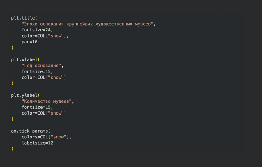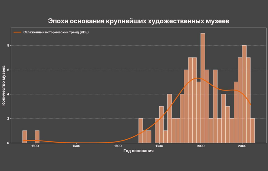Этот график показывает, в какие периоды чаще всего основывались крупнейшие художественные музеи. Видно, что основной рост приходится на XIX и начало XX века — именно в это время появляется большинство крупных музеев. Более ранние даты встречаются редко, а в конце XX века заметна ещё одна волна оснований, но уже менее выраженная.