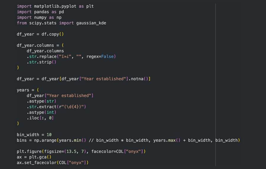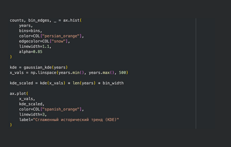 • Непараметрическая оценка плотности распределения (KDE) — использовалась для сглаживания распределения годов основания музеев и выявления долгосрочных исторических волн в развитии музейной инфраструктуры.