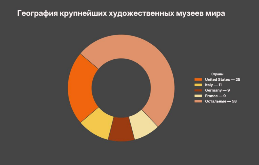 Диаграмма показывает, в каких странах сосредоточено наибольшее количество крупнейших художественных музеев. Больше всего музеев находится в США, далее идут Италия, Германия и Франция. При этом значительная часть музеев относится к категории «остальные страны», что говорит о том, что крупные музейные институции распределены по миру достаточно широко, а не сосредоточены только в нескольких государствах.