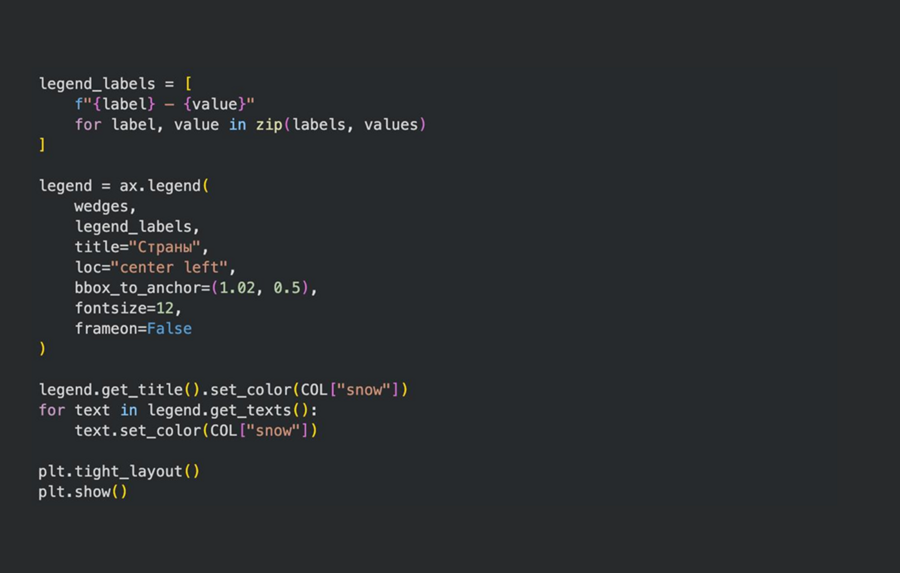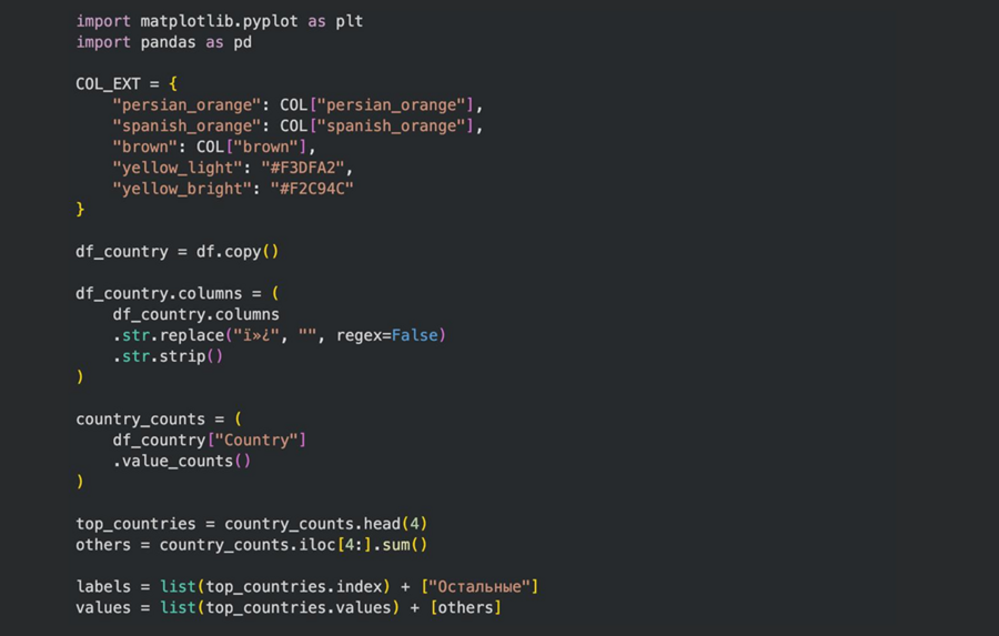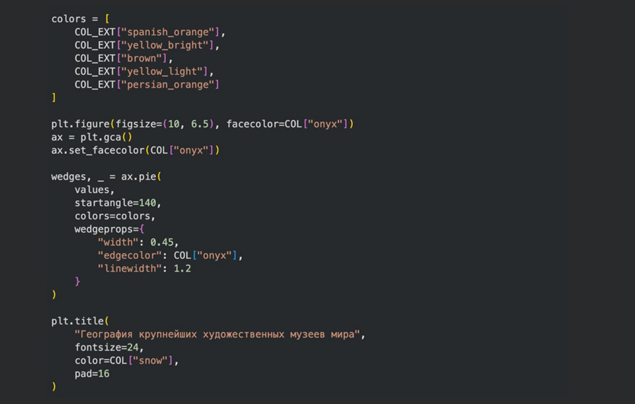 • Анализ долей и структурных пропорций — реализован с помощью кольцевой диаграммы, что позволило оценить относительную представленность стран в общем массиве крупнейших музеев.