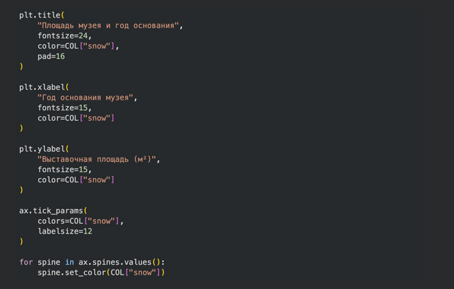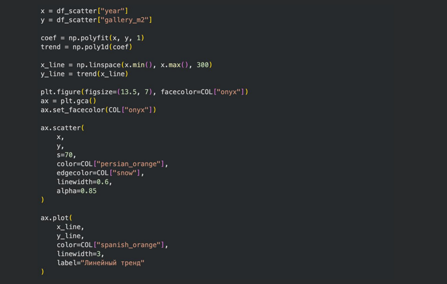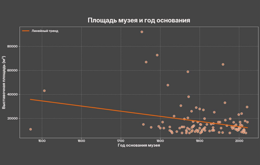 • Корреляционно-регрессионный анализ — использовался для изучения связи между годом основания музея и его выставочной площадью. Линейная регрессия позволила выявить общий тренд изменения масштабов музеев во времени.