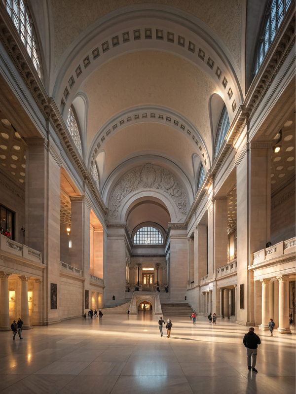 1. Create an imaginary museum that represents the world’s greatest cultural institutions. Vast monumental space, emphasis on scale and openness, minimal yet powerful architecture, soft dramatic lighting, calm refined color palette, atmosphere of cultural significance, timelessness, and quiet grandeur.