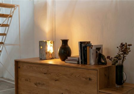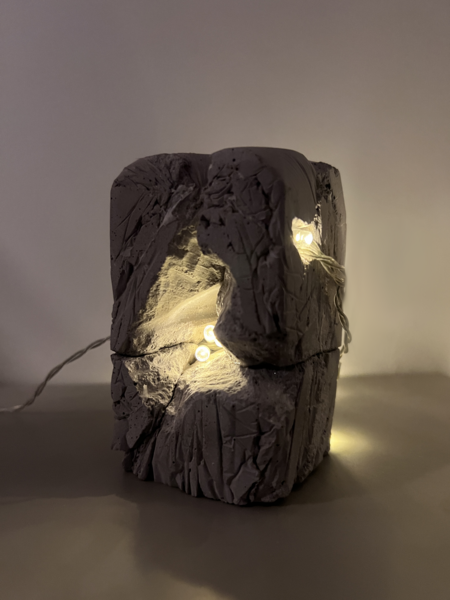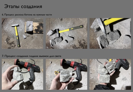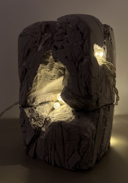 Светильник-артефакт, который переносит эстетику «скелета» современного города в жилой интерьер. Он представляет собой фрагмент строительного монолита — кусок грубого бетона с естественными сколами, словно вырезанный из несущей стены высотки. Идея проекта выворачивает суть материала наизнанку: привычно холодная и глухая бетонная преграда здесь становится источником тепла. Свет пробивается сквозь трещины и разломы, создавая ощущение, что внутри застывшего камня живет энергия, позволяя владельцу держать у себя на столе «живую» часть фундаментальной архитектуры.