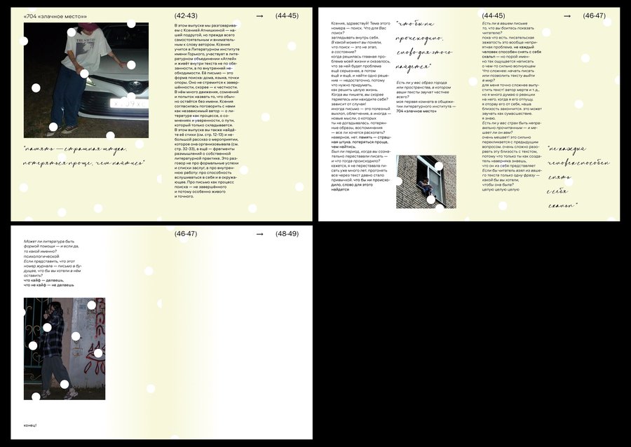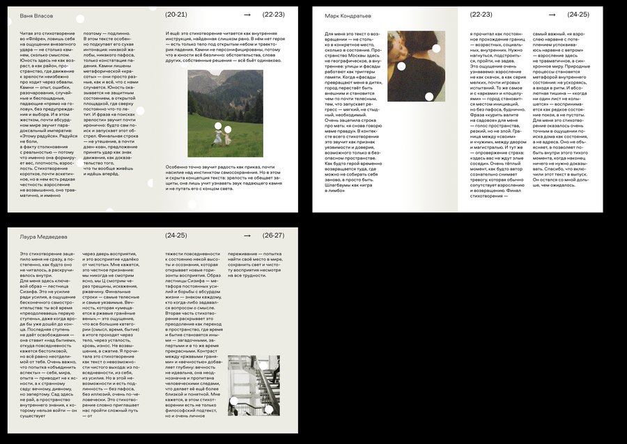 (1) стихотворения (2) анализ предыдущих стихотворений читателями (3) блок с рекомендациями «Куда сходить» (4) блок с рекомендациями «Что почитать» (5) интервью с молодым автором — Ксенией Атнишкиной