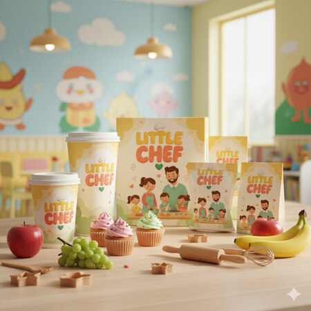Запрос: Realistic 3D mockup of «Little Chef» brand packaging set — includes lunch box, smoothie cup, dessert box, and paper bag. Each item displays the Little Chef logo in playful 3D dough-like letters, with pastel yellow, pink, and green accents. Add cheerful illustrations of children and parents cooking together — rolling dough, mixing bowls, decorating cupcakes. Soft studio lighting, clean white background, cozy and joyful family vibe.