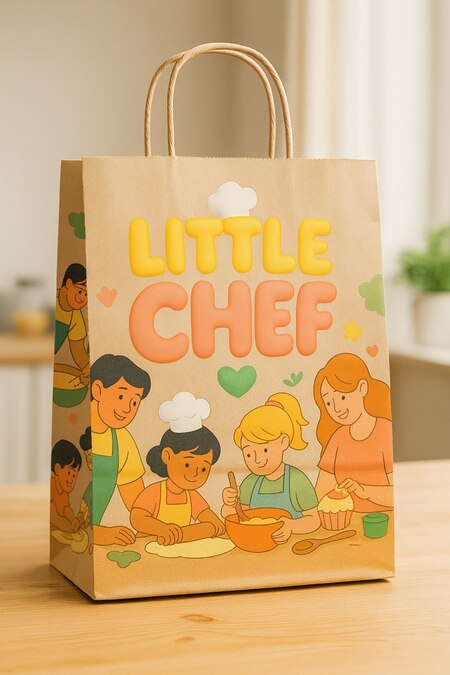 Бумажный пакет с логотипом (takeaway bag) Запрос: Realistic 3D mockup of a paper takeaway bag for «Little Chef.» Printed with the Little Chef logo in soft pink and yellow tones and a small green heart below. Illustrations of kids and parents cooking together wrap around the bag. Soft shadows and natural lighting on a wooden table, cozy and inviting atmosphere.