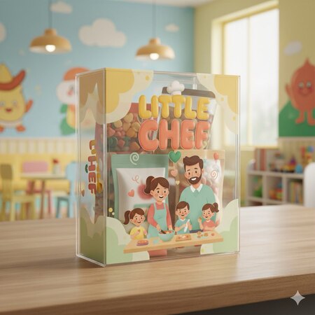 Детский набор / family meal kit box Запрос: Realistic 3D mockup of a «Little Chef» family meal kit box. The box design includes the Little Chef logo, pastel yellow-pink-green colors, and illustrations of smiling children and parents preparing food together. Add realistic textures like smooth cardboard and glossy logo print. Warm light and home kitchen background to emphasize family warmth and togetherness. Запрос для правки: Make a plastic box