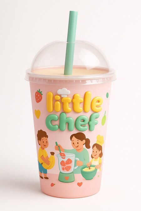 Стакан для напитков / smoothie cup mockup Запрос: Realistic 3D mockup of a children’s smoothie cup for «Little Chef.» The cup features the Little Chef logo and colorful illustrations of kids and parents making fruit smoothies together. Use bright pastel pink, yellow, and mint-green colors with a smooth matte finish. Add playful fruit elements and heart details. High-quality lighting and reflections for a professional product photo look.