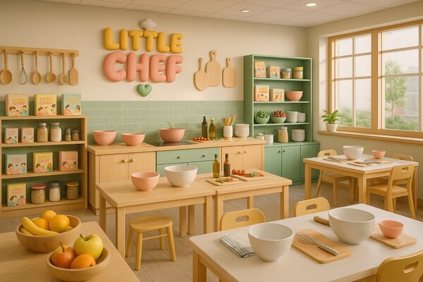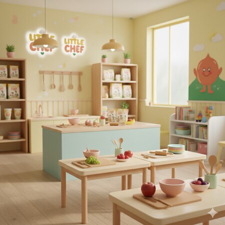 Запрос чату GPT: Write a promt to generate a marketplace for a cafe where children and parents cook with the chef. No people in the photos