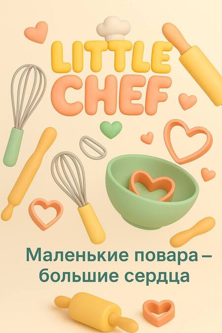 Слоган: «Маленькие повара — большие сердца» Запрос: 3D poster design for «Little Chef» children’s café with the slogan «Маленькие повара — большие сердца.» The scene shows a soft, warm composition of pastel 3D cooking tools — rolling pins, whisks, bowls, and heart-shaped cookie cutters — arranged around the «Little Chef» logo. Include floating heart shapes, warm lighting, and soft shadows to create a cozy, loving family vibe. Colors: pastel pink, sunny yellow, mint-green. No people, just cute symbolic 3D objects conveying love and care.