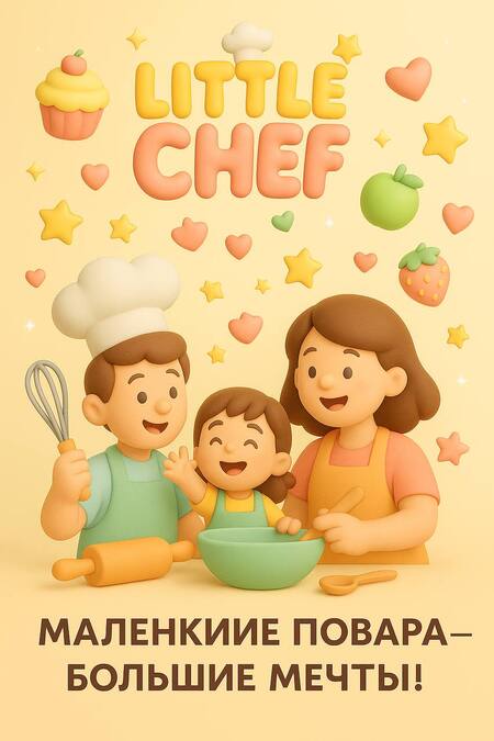 Слоган: «Маленькие повара — большие мечты!» Запрос: 3D poster for «Little Chef» with the slogan «Маленькие повара — большие мечты!» The design features dreamy 3D elements floating in the air — cupcakes, stars, hearts, fruits, and a chef’s hat — surrounding the «Little Chef» logo. Use bright pastel colors, soft gradients, and a glowing atmosphere that symbolizes imagination and ambition. Add a touch of sparkle or gentle light rays for a magical, hopeful feeling. The mood: inspiring, joyful, and full of childlike wonder.