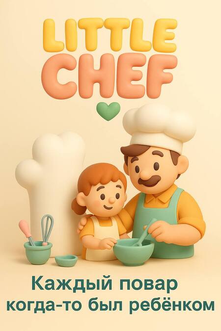 Слоган: «Каждый повар когда-то был ребёнком» Запрос: 3D poster design for «Little Chef» featuring the slogan «Каждый повар когда-то был ребёнком.» The composition shows a large chef’s hat next to small cooking tools — a tiny whisk, spoon, and bowl — symbolizing childhood beginnings. Add playful pastel colors (yellow, pink, mint), soft textures, and a warm, nostalgic light. Include the «Little Chef» logo above or below the scene. The design feels sentimental yet joyful, representing growth and family connection.