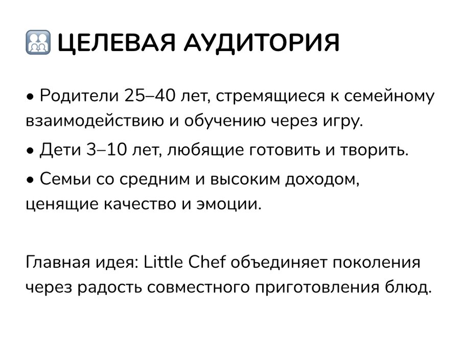 Little Chef — готовим вместе, растём с любовью! Little Chef — это детское кафе, где родители и дети становятся одной командой. Вместо привычного похода в ресторан мы предлагаем формат совместного кулинарного творчества — готовим вместе с шефом, пробуем новые вкусы и учимся через игру и радость общения. В Little Chef каждый ребёнок чувствует себя настоящим поваром: лепит, украшает, смешивает — и гордится результатом, а родители получают редкую возможность провести время с детьми в тёплой, уютной атмосфере, создавая не только блюда, но и воспоминания. Little Chef — это вкус, радость и семейное единство на кухне.
