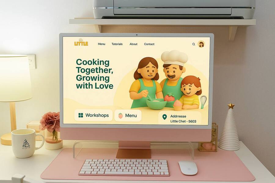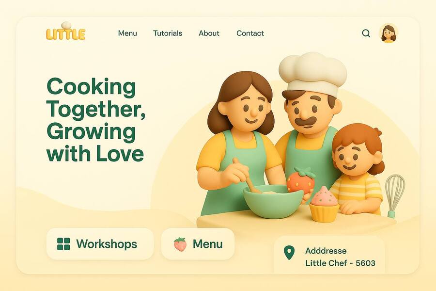 Запрос: > 16:9 realistic 3D rendering of the web design of the Little Chef children’s cafe homepage. The layout includes a top navigation bar with a logo (a small logo in soft pastel colors — yellow, pink, and mint green) and navigation buttons such as «Menu,» «Tutorials,» «Information,» and «Contact.» > > The top of the large hero section features the slogan «Cooking Together, Growing with Love, ” as well as a playful 3D illustration depicting children and parents cooking. > > Add a rounded profile image area in the top-right corner for the user account, with a small drop-down menu icon.