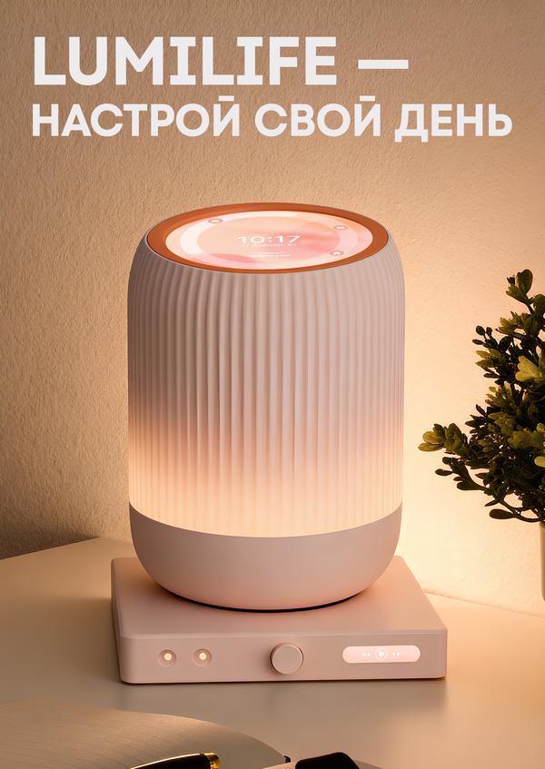 Умная колонка-ночник, которая создаёт персонализированную атмосферу через синхронизацию света, звука и контента с биоритмами человека.