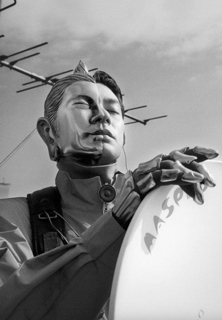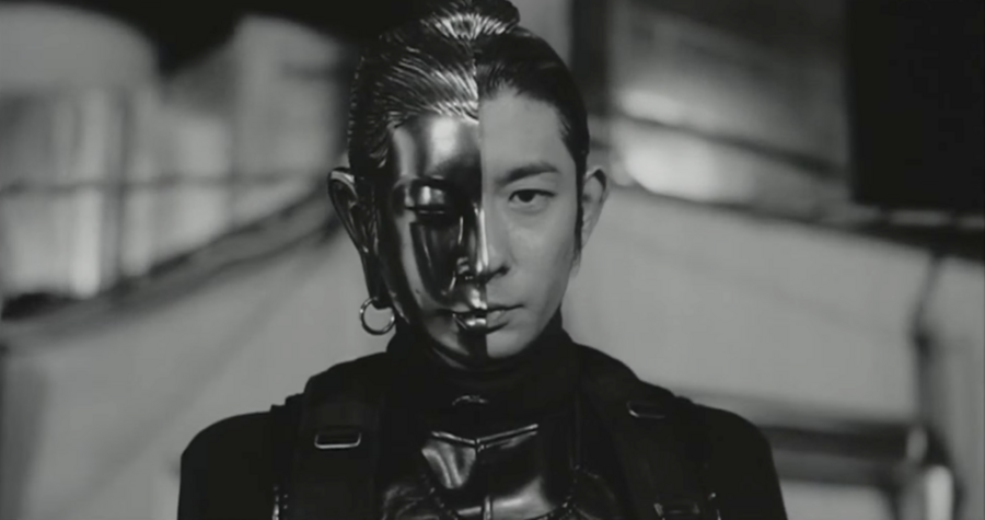 Ключевой эпизод — разгон и финальная схватка на крышах. Крупные планы, пересветы, зерно плёнки и вспышки молний буквально стирают мимику: лицо Моррисона становится плоским знаком, графической маской, по которой «бежит» ток. Образ Thunderbolt Buddha — тоже маска: имя-персона и электроника на теле превращают его лицо в передатчик. Музыка-ошибка, кабели, электрические разряды — это медиум между внутренним возбуждением и внешней реальностью города. Маска здесь не предмет на коже, а техно-протез и перформативная роль, которые производят и одновременно отчуждают «я». Фильм показывает, как современная идентичность буквально становится сигналом: внутренний импульс виден только как шум, вспышка и эмблема на поверхности лица.