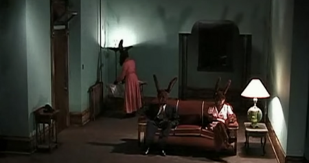 В Rabbits (2002) Линч помещает трёх актёров в полноразмерные костюмы с огромными головами-кроликами и расставляет их в «гостиной» ситкома: диван, лампа, закадровый смех, раскаты грома, обрывочные реплики, двери, из которых иногда появляется нечто. Маски здесь делают сразу несколько вещей. Они лишают лицо мимики и звёздной узнаваемости (под головами — Наоми Уоттс, Лора Харринг, Скотт Кофи), превращая людей в иконки-типажи: Муж, Жена, Гость. Вместо психологии — ритм, интонация, паузы, как в ритуальном театре: слова звучат как заклинания, а смех и аплодисменты включаются не к месту, напоминая, что «быт» — это разыгранная форма. Фиксированная звериная морда отсекает «человечность» и обнажает механизм жанра: дом превращается в маскарадную сцену, где повторы и звуковые петли создают тревогу. Кроличьи головы — не просто маски, а инструмент отчуждения и усиления: они снимают психологию, превращают ситком в литургию, демонстрируют искусственность телевидения и дают зрителю увидеть за сценкой безличную тревогу, которая и есть подлинный герой фильма.