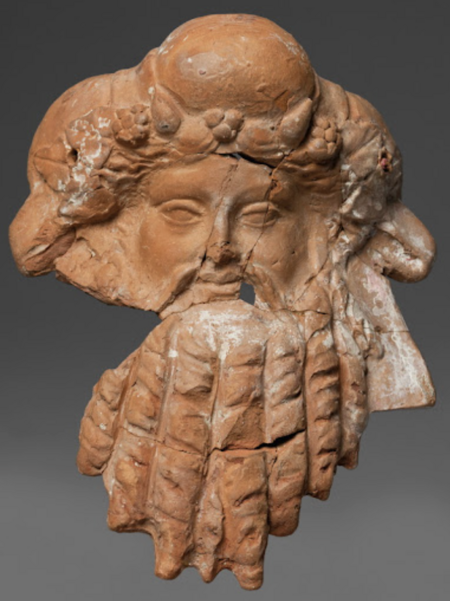 Театральная маска Диониса, терракота, II–I в. до н. э. и бородатая маска Диониса, Пантикапей, глина, белый грунт, розовая краска, третья четверть II–начало I в. до н. э.,