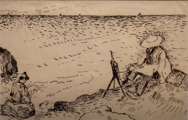 слева — Анри Матисс — Женщина рядом с водой, 1905 справа — Андре Дерен — Матисс, пишущий Мадам Матисс в японском халате на берегу моря, 1905