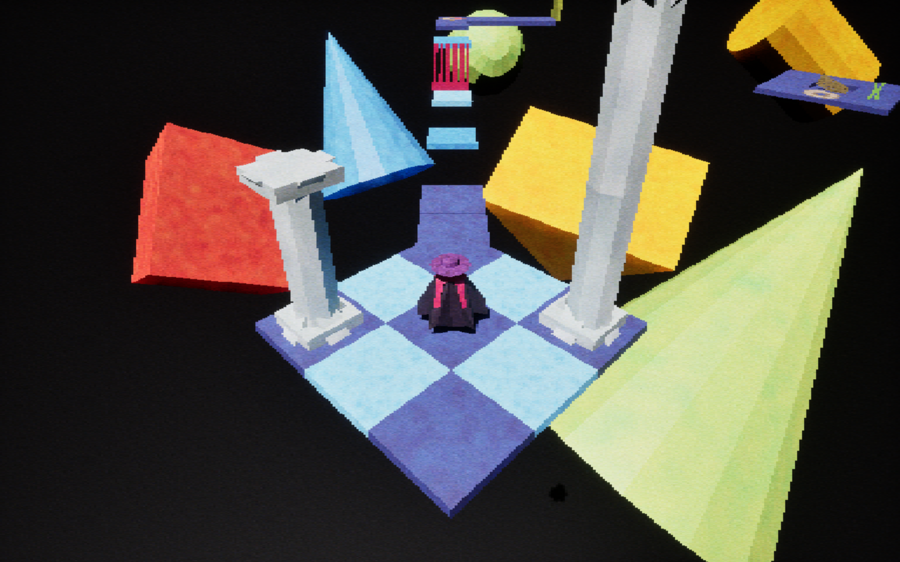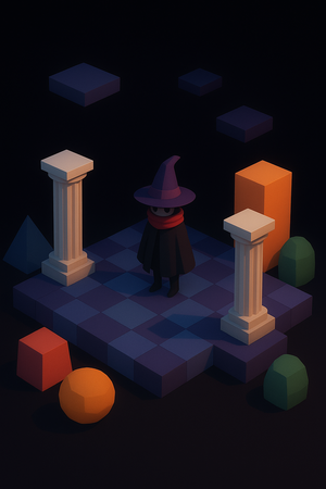 Chat GPT please, draw Isometric scene in low-poly 3D style, a fantasy environment with a chessboard floor made of blue and purple squares, two white ancient columns standing on each side, a character wearing a purple hat and a black cloak with a red scarf standing in the center and looking forvard. Surrounding the platform are gigant simple geometric shapes in bright colors. In the background a road consisting of floating platforms suspended in the void. Soft lighting, black background, surreal and atmospheric style inspired by avant-guard art style