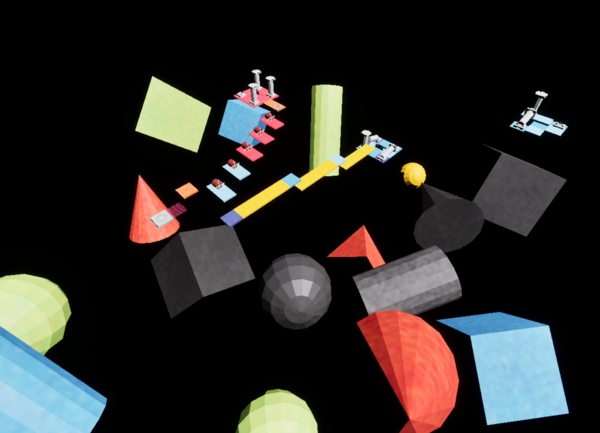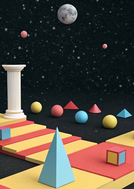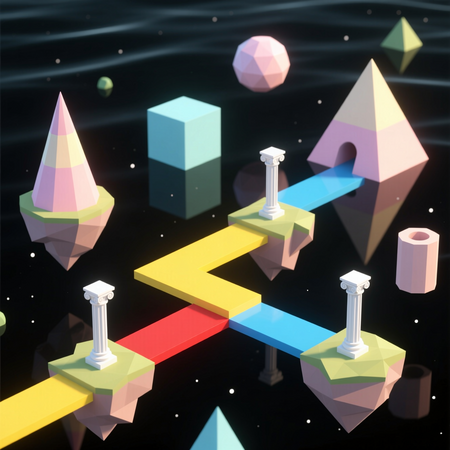 Qwen-3 Max Abstract low-poly 3D scene set in outer space, featuring colorful floating geometric shapes — cones, cubes, cylinders, spheres, and pyramids — scattered across a black void. A surreal pathway made of bright rectangular platforms in yellow, red, and blue leads between small floating platforms with white classical columns. The lighting is soft and even, emphasizing the pastel textures of the shapes. The overall composition feels dreamlike, minimalist, and inspired by surreal puzzle games like Monument Valley and Fez.