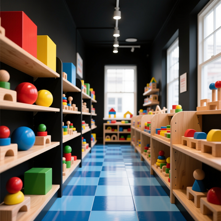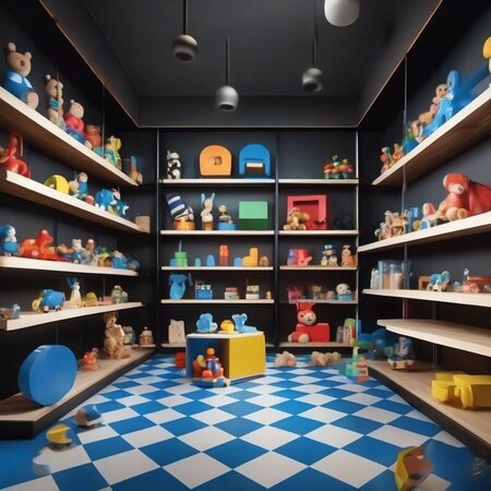 Qwen-3 Max, Stable Diffusion XL A toy’s store, an interior in bright colors, black walls, a checkered blue floor, shelves with minimalistic wooden toys consisting of simple shapes and colorful, lots of light. Photorealistic style