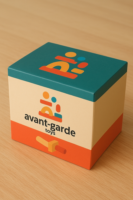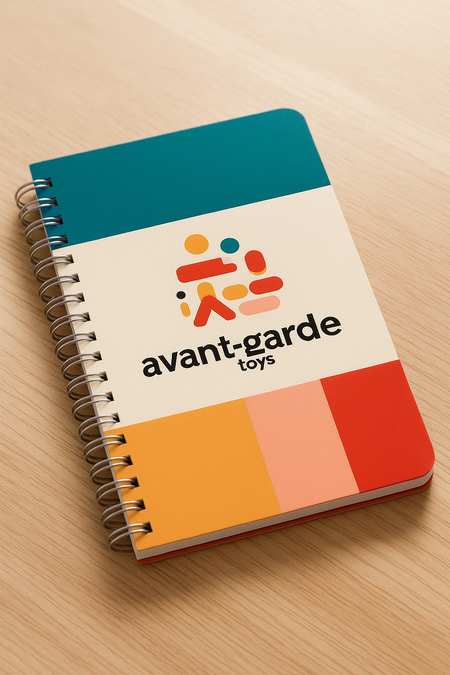 ArtList Branding board for a toy’s store named «Avant-garde toys». Minimalism and simple logo combining text and an illustration of wooden toys blended with simple shapes, avant-garde, retro aesthetic, color palette