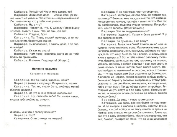 Если представленный слева фрагмент условно является партией режиссёра, то фрагмент справа является партией как режиссёра, так и актеров. В нём прописаны реплики и краткие инструкции, содержащие информацию о том, кто из действующих лиц в тот или иной момент оказывается на сцене или уходит.