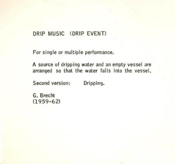 Для перфомансов и хэппенингов также характерно наличие коротких инструкций (партитур) по исполнению. Особенно данная практика распространена среди флюксус-художников.