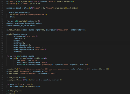 1. Выявить «золотые века» кинематографа: Мы можем определить десятилетия, которые были особенно «плодотворными» на создание фильмов, получивших высочайшее народное признание и вошедших в престижный список IMDb. Например, если линия достигает пика в 1990-х или 2000-х, это указывает на высокую концентрацию шедевров в эти периоды. 2. Проследить тренды: График показывает, как менялась «производительность» высококачественного кино на протяжении десятилетий. Увеличивается ли количество фильмов со временем, или, наоборот, лучшие из лучших появлялись преимущественно в старых эпохах? 3. Оценить «выдержку» фильмов: Можно заметить, что очень старые десятилетия могут иметь меньшее количество фильмов, что естественно, так как меньше фильмов из прошлого выдерживают испытание временем и остаются в топах. С другой стороны, слишком новые десятилетия также могут быть недопредставлены, поскольку фильмам нужно время, чтобы завоевать народную любовь и занять место в Топ-100. 4. Подтвердить или опровергнуть интуитивные предположения: Например, если бы мы ожидали, что большинство Топ-100 фильмов были сняты в «классическую» эру Голливуда, график покажет, насколько это соответствует действительности.