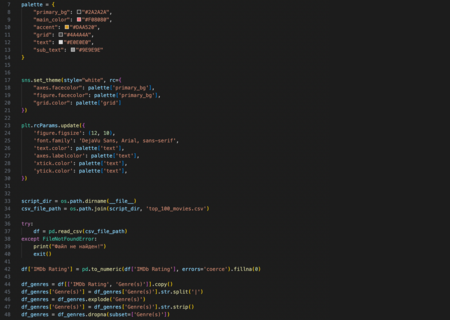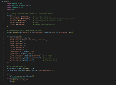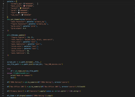 • Проверка гипотез: Я исследовал, существует ли корреляция между народным признанием (IMDb Rating) и официальным признанием (Oscars Won), а также коммерческим успехом (Box Office). • Выявление паттернов: Мне было интересно узнать, какие десятилетия были наиболее «плодотворными» на шедевры, какие жанры стабильно получают высокие оценки, и кто из режиссеров является «чемпионом» по попаданию в этот престижный список. • Объективность: Список Топ-100, в отличие от списков критиков, является динамичным и массовым, что делает его идеальным объектом для статистического анализа.