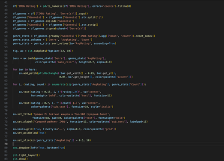 1. Ранжирование по качеству: Сразу видно, какие жанры лидируют по среднему баллу (например, Драма, Биография, Военный) и какие находятся в нижней части рейтинга (например, Фантастика, Триллер). 2. Оценка стабильности жанра: Рядом со средним рейтингом указано количество фильмов данного жанра в списке. Это позволяет понять: высокий рейтинг обусловлен одним-двумя исключительными фильмами, или же жанр стабильно производит шедевры (например, если у Драмы самый высокий рейтинг и при этом наибольшее количество фильмов). 3. Понимание предпочтений аудитории: График показывает, что аудитория, формирующая Топ-100, склонна высоко ценить фильмы, которые, вероятно, фокусируются на глубоких человеческих историях и серьезных темах (Драма, Биография), в сравнении с жанрами, ориентированными на зрелищность (Экшн, Фантастика).