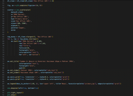 Корреляция «Деньги vs Качество»: Можно визуально оценить, существует ли прямая зависимость между рейтингом IMDb и кассовыми сборами. 1. «Сладкое пятно»: Фильмы, расположенные в правом верхнем углу (высокий рейтинг и высокие сборы) — это настоящие блокбастеры-шедевры, которые понравились и критикам, и массовой аудитории. 2. «Артхаусные шедевры»: Фильмы с очень высоким рейтингом, но относительно небольшими сборами (верхний левый угол), могут быть менее коммерчески успешными, но очень высоко оценены ценителями. 3. «Жанровые хиты»: Фильмы с высоким, но не наивысшим рейтингом, но при этом с огромными сборами (правый нижний угол) — это часто массовые развлекательные картины, привлекающие широкую аудиторию.