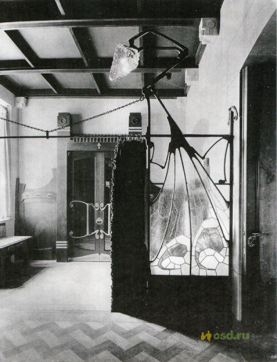 В оформлении всех интерьеров прослеживаются природные мотивы, характерные для модерна. Уже со входа в здание можно увидеть множество деталей, отсылающих к царствам растений и животных. Вход в вестибюль был выложен мозаикой, имитирующей круги, расходящиеся на воде. Входная зона особняка устроена как последовательность «сцен», где утилитарное сразу превращается в художественное впечатление. Пространство вестибюля было разделено прозрачными витражными ширмами, в которых читаются силуэты богомолов с распахнутыми крыльями. Это отражает типичный для модерна приём, когда декор одновременно работает как конструкция и как образ.