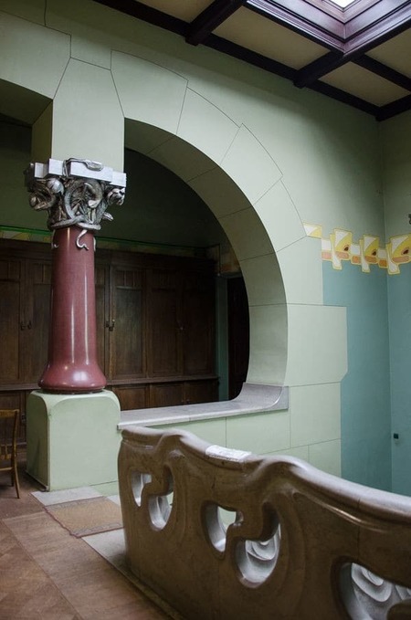 Лестничный марш отделён от вестибюля тонкой стеной с цветным витражом, на котором изображён пейзаж с холмами и деревьями. Таким образом, даже перегородка превращается в декоративный экран и одновременно — в «окно» в условную природу.