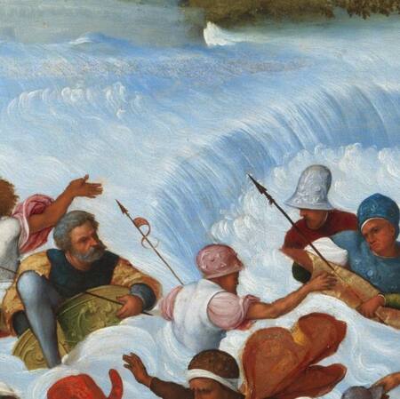 На картине «Буря на море», приписываемой Питеру Брейгелю Старшему изображена бурная морская сцена. [9] Множество кораблей борются с высокими, пенистыми волнами, а небо затянуто тёмными грозовыми облаками, создавая ощущение хаоса и опасности. В волнах видны обломки и даже гигантская рыба с бочкой, символизирующие непредсказуемость стихии и уязвимость человека, тогда как на горизонте едва заметны контуры церкви или башни, намекающие на надежду и духовную опору.