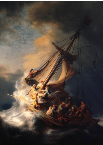 Картина «Христос во время шторма на море Галилейском» (1633) работы Рембрандта ван Рейна изображает библейский эпизод, когда Христос и его ученики оказались в лодке во время сильного шторма на Галилейском море. [7] Центральная фигура — Христос — спокойна и собрана, свет сосредоточен на нём, подчёркивая его духовное превосходство и внутреннюю силу, тогда как ученики в панике тянут паруса, держатся за борт и кричат друг другу, передавая страх и отчаяние.
