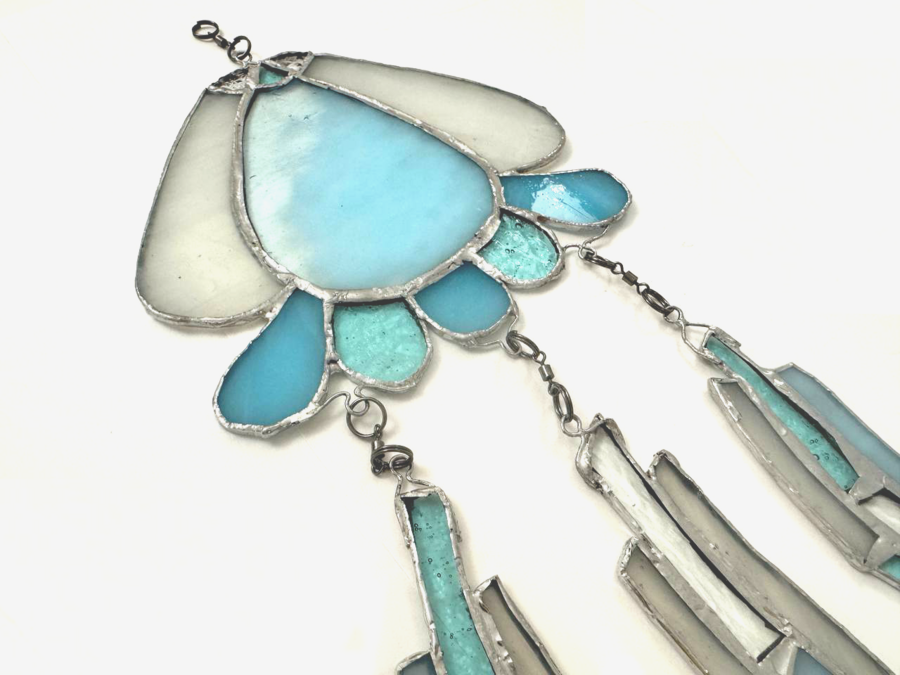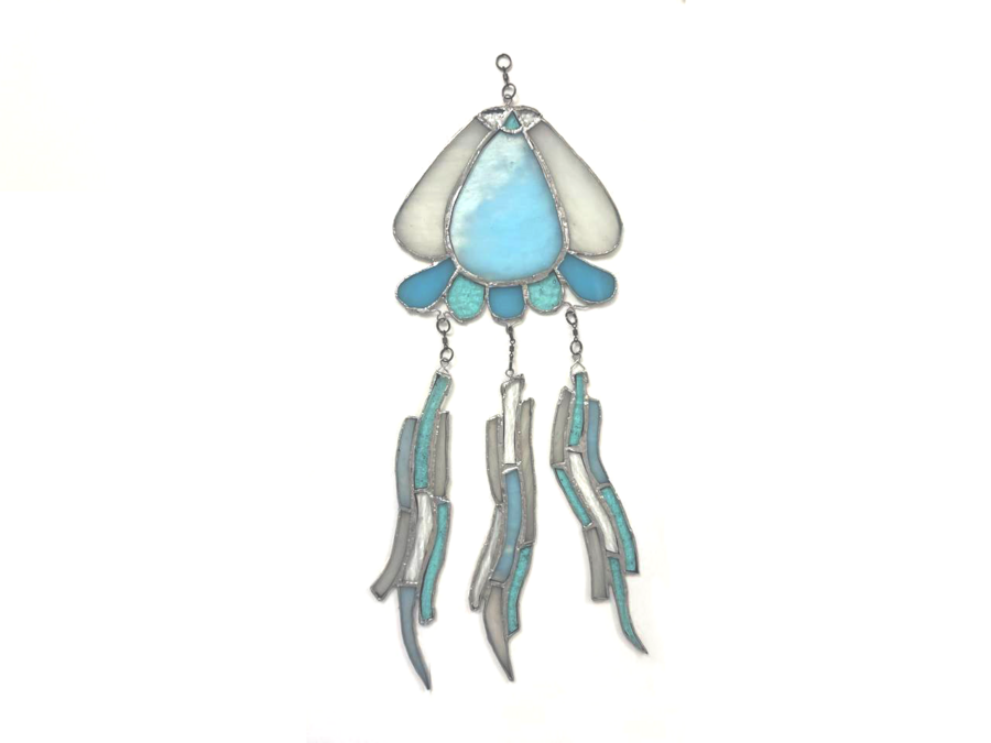 Форматы каждого элемента: Голова медузы: 14 × 10 см Щупальца: 22 × 5 см Материалы: стекло, олово, проволока, фурнитура (кольца и вертлюги)