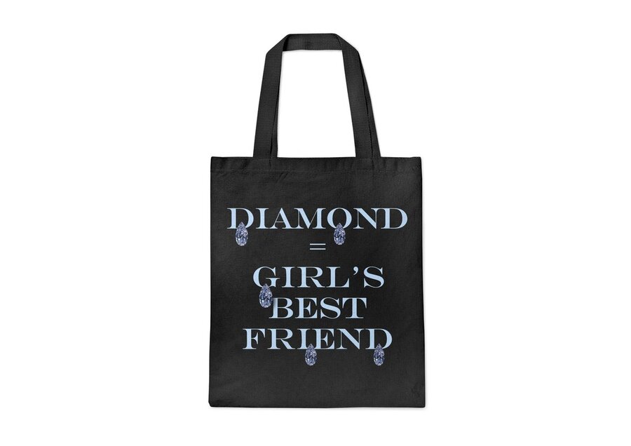 A premium, structured canvas tote bag, off-white or deep navy blue, standing upright on a marble surface. The bag features a large, central, sophisticated line-art design of the Neptunian rings, delicately intertwined with a necklace from which a single diamond pendant hangs. The design is printed in a glossy, raised ink or a subtle metallic foil (pantone silver or cool blue). The bag has sturdy leather handles and crisp folds, suggesting it’s new and high-quality. The lighting is soft and bright, highlighting the texture of the canvas and the sheen of the print. Lifestyle product photo, realistic, detailed.
