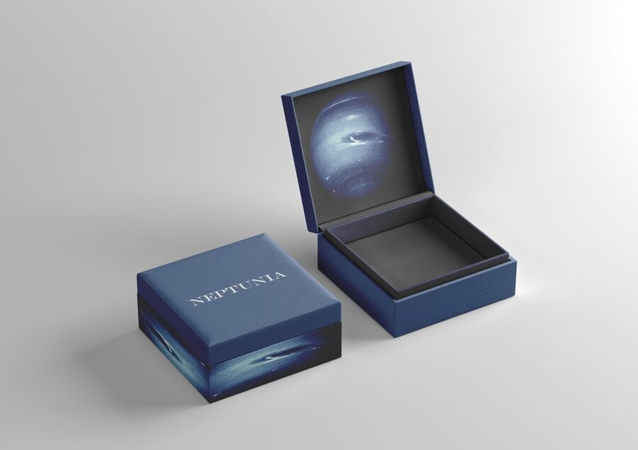 An ultra-luxurious jewelry box for «Neptunia» on a dark, reflective surface. The box is made of deep midnight blue velvet with a texture that resembles the swirling gases of Neptune. In the center, the salon’s logo is debossed (stamped in) with a silvery, metallic foil that shimmers. The logo is a simple, clean icon: a circle (planet) with a single vertical line (rain) ending in a diamond shape. The inside of the open box is lined with ultra-plush, black silk, with a perfect indentation for a ring. The lighting is dramatic, with a spotlight creating a soft glow on the box, making the velvet texture and foil stamp gleam. Photorealistic, 8K, professional product photography.