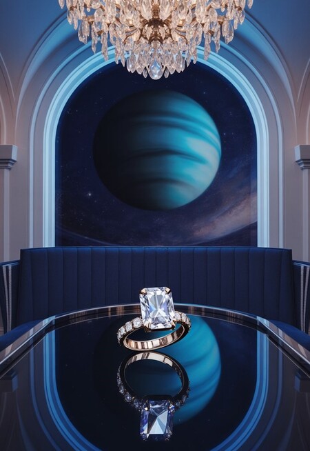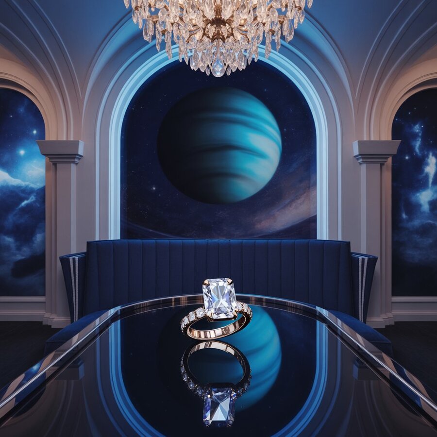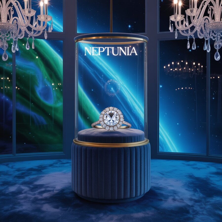 Create an image of the variety of diamond jewelry pieces are depicted, sparkling and shimmering in the light. The composition should include: 1. Rings: Elegant wedding bands featuring large diamonds, adorned with thin gold or platinum bands. 2. Earrings: Long dangling earrings with a cascade of small diamonds that beautifully reflect light. 3. Bracelets: Wide bracelets encrusted with large diamonds, creating a sense of luxury. 4. Necklaces: Delicate necklaces with a central diamond surrounded by smaller stones, sparkling like stars. In the background, Neptune is portrayed as a majestic planet with deep blue and green hues. The atmosphere of Neptune should be rich and mysterious, with clouds that give a sense of movement. The image should convey the effect of diamonds raining down from the sky. The diamonds should resemble droplets of water, reflecting light and creating a rainbow of glimmers. Some diamonds can be depicted mid-air, giving the impression that they have just begun to fall. The sky above Neptune should be dark and starry, with bright stars and possibly a few other planets or moons in the backdrop. Lighting: Use soft yet bright lighting to highlight the brilliance of the diamonds and create contrast between the jewelry pieces and the cosmic background.