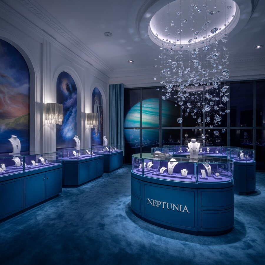 Create an image of a luxurious jewelry salon named «Neptunia.» The interior is designed in an Art Deco style, featuring elegant lines and a rich color palette that includes deep blues and greens, reflecting the atmosphere of the planet Neptune. The salon’s windows are made of transparent glass, showcasing sparkling diamonds. The building’s facade features a stylish sign with the name «Neptunia,» crafted from gold and adorned with small diamonds. Inside the salon, there is an ambiance of comfort and luxury. The floors are covered with a plush carpet in a deep blue hue, while the walls are decorated with paintings depicting Neptune and cosmic landscapes. The lighting is soft, with crystal chandeliers that create the effect of starry brilliance. In the display cases, a variety of jewelry items are showcased. Through open windows or special doors, diamonds seem to fall into the salon like rain. These diamonds vary in size and shape, sparkling in the light and creating a magical spectacle. Some have already touched the floor, forming a shimmering carpet of jewels. Outside the windows, a cosmic landscape is visible, with Neptune on the horizon—its deep blue and green clouds create an air of mystery. The sky is dark and dotted with stars, enhancing the fantastical atmosphere. On tables within the salon, there are jewelry boxes displayed open to showcase the pieces. Staff members in elegant uniforms assist customers, marveling at the beauty of the diamonds and their unique origin from Neptune.