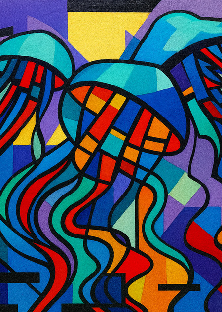 И именно в этот момент нас осенила идея: объединить всё — реальные детские рисунки, пластичные формы нефти и динамику нейроизображений. Мы решили наложить несколько слоёв: цифровую текстуру, нейросетевую обработку и работы юных авторов с динозаврами. Так появилась новая визуальная глубина — синтез технологий, воображения и живого человеческого творчества.